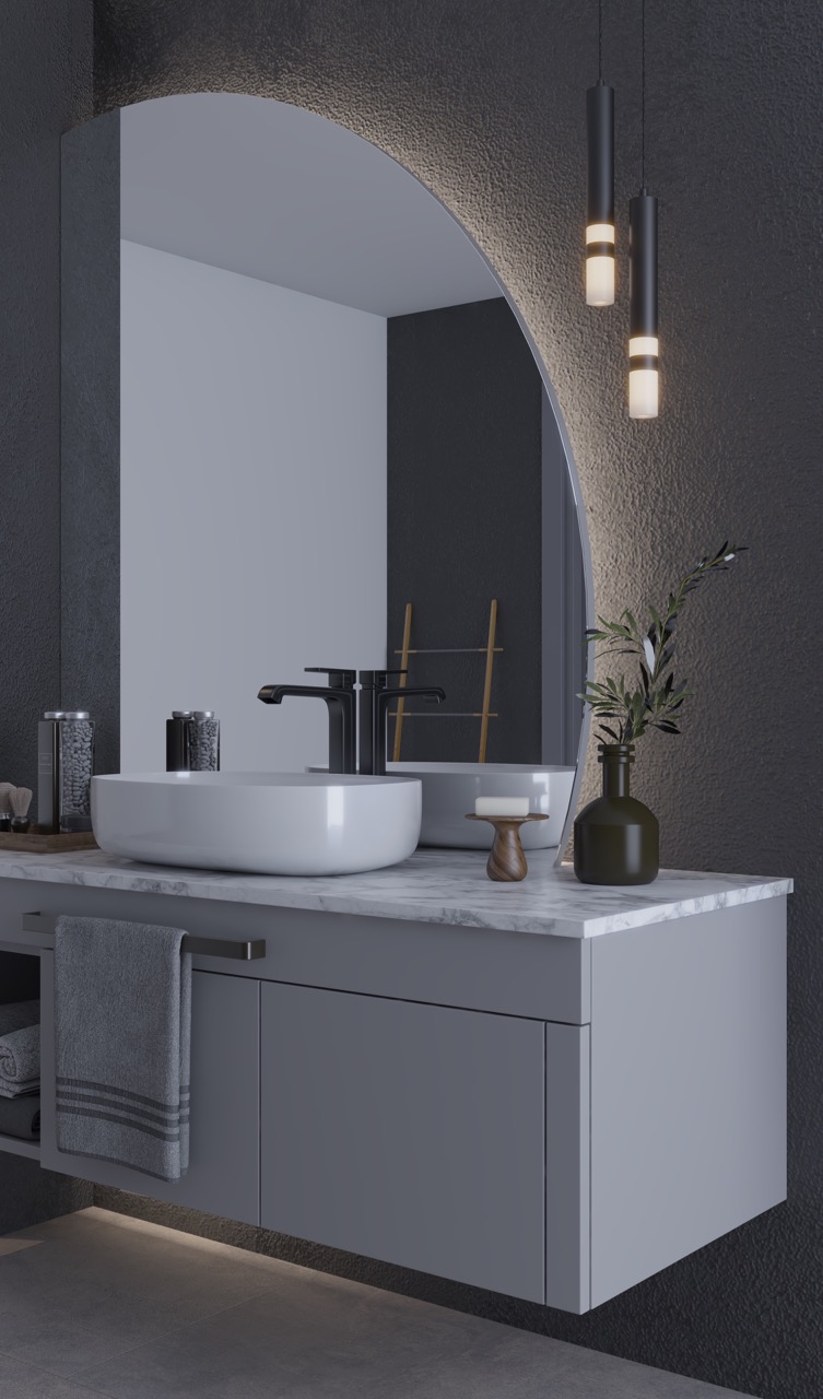 Rijit formuyla mekâna sade bir şıklık kazandıran bu tasarımda yer alan açık raflar ve farklı formlarda kullanılabilecek ayna ve aydınlatma detayları görselliği arttırırken sadelik , şıklık ve fonksiyonelliği bir arada bizlere sunuyor.